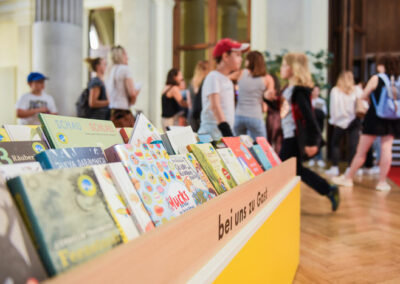 Einzigartig ist die große Buchausstellung, die mit mehr als 1.000 Kinder- und Jugendbüchern Lektüretipps für jedes Alter und Leseinteresse bereithält und zum gemütlichen Schmökern und Entdecken einlädt. In Lesungen und Kreativwerkstätten kann das junge Publikum den Buchkünstler*innen persönlich begegnen und Literatur hautnah erleben. Mitmachformate wie Erzähltheater und Kamishibai wecken schon bei Kindern ab 3 Jahren die Lust an Geschichten, auf dem Wiener Geschichtenteppich dürfen alle von klein bis groß sprachspielerisch tätig werden.